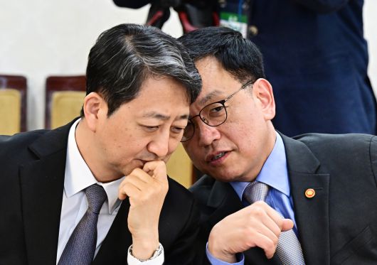 안덕근 산업통상자원부 장관(왼쪽)과 최상목 경제부총리가 지난 21일 서울 종로구 정부서울청사에서 열린 경제안보전략 TF회의에서 이야기를 나누고 있다.대통령실사진기자단 |