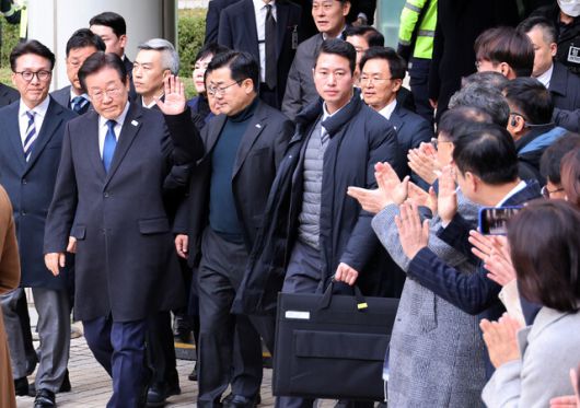 이재명 더불어민주당 대선 경선 후보가 지난해 11월25일 서울 서초동 서울중앙지방법원에서 열린 위증교사 혐의 재판 1심 선고에서 무죄 판결을 받은 뒤 법원을 떠나고 있다. 공동취재사진 |