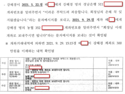 ○검사: 위와 같이 피의자가 600만원을 강혜경 계좌로 송금한 직후 명태균은 피의자에게 아래와 같이 '210522-전국정기5차-1.pdf' 파일 등 여론조사 결과를 보내주면서 공표예정인 사실을 알려주고, "회장님 도와주셔서 감사합니다"라는 말을 하는 것으로 보아, 피의자가 위와 같이 강혜경에게 보내준 금원으로 이 여론조사를 진행하였고 그 결과를 피의자에게 보내면서 감사인사하는 것으로 보이는데 어떠한가요검찰은 배 씨가 당대표 여론조사 비용을 계좌 송금 외에 현금으로 건넨 사실도 있다는 관계자 진술도 확보한 상태다.