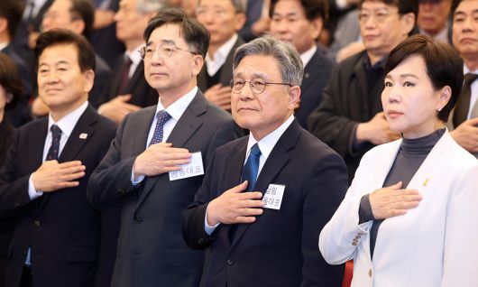 지난 16일 서울 여의도 국회도서관 대강당에서 열린 더불어민주당 이재명 대선 경선후보의 싱크탱크 '성장과 통합' 출범식에서 유종일·허민 상임 공동대표가 국기에 경례하고 있다. 앞줄 왼쪽부터 더불어민주당 정동영 의원, 유종일·허민 상임 공동대표, 더불어민주당 전현희 의원. 연합뉴스 |