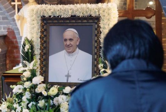 22일 오후 지난 21일(현지시간) 선종한 프란치스코 교황의 빈소가 마련된 서울 중구 명동대성당 지하성당에서 조문객들이 추모를 하고 있다. 2025.04.22 사진공동취재단 |