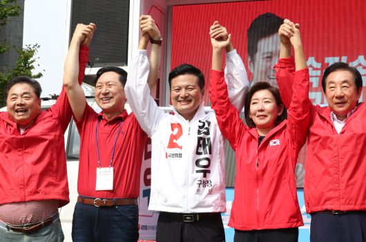 국민의힘 김태우 강서구청장 보궐선거 후보의 선거대책위원회가 2023년 9월 28일 오전 발산역 인근에서 연 선대위 출정식에서 참가자들이 손을 들어올리고 있다. 왼쪽부터 구상찬 전 의원, 김기현 대표, 김태우 후보, 나경원 전 의원, 김성태 전 의원. /연합뉴스 |