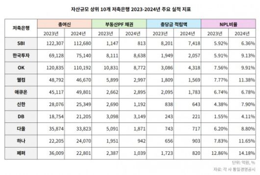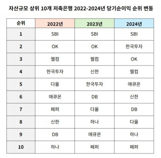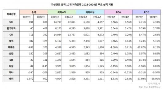 21일 한국금융신문이 자산 기준 상위 10개 저축은행(SBI, 한국투자, OK, 웰컴, 애큐온, 신한, DB, 다올, 하나, 페퍼)의 2024년 경영공시를 분석한 결과, SBI저축은행이 이자비용 및 충당금 적립 부담 감소로 연간순익 808억원을 기록했다.