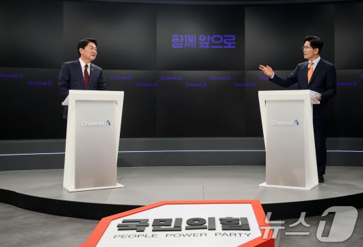 국민의힘 대선 2차 경선 진출자인 안철수(왼쪽), 김문수 후보가 24일 오후 서울 종로구 동아미디어센터 채널A 스튜디오에서 1:1 맞수 토론을 하고 있다. 2025.4.24/뉴스1 ⓒ News1 국회사진취재단 |