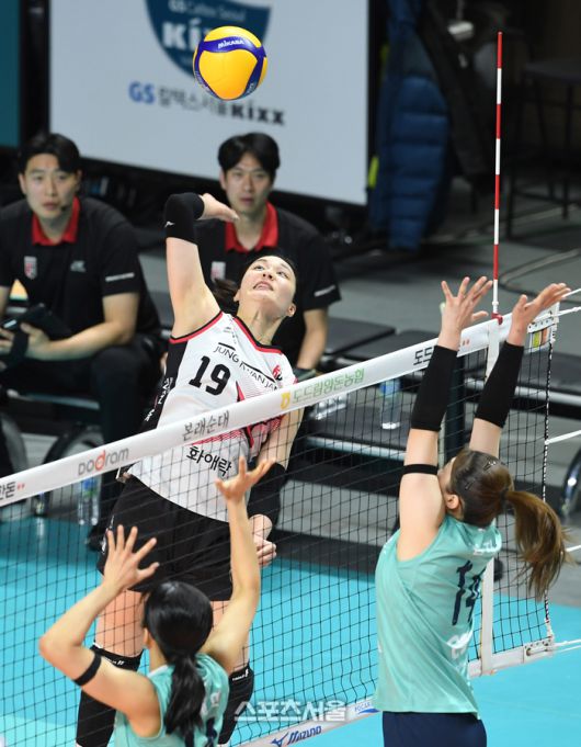 정관장 표승주(왼쪽 위)가 10일 장충체육관에서 열린 2024-2025 V리그 GS칼텍스와 경기에서 스파이크 공격을 하고 있다. 2025. 1. 10. 장충 | 박진업 기자 upandup@sportsseoul.com |