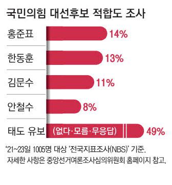 한편 홍준표 전 대구시장, 한 전 대표, 김 전 장관 등 '빅3' 지지율이 오차범위 안에서 팽팽한 접전을 벌이고 있다. 엠브레인퍼블릭·케이스탯리서치·코리아리서치·한국리서치가 지난 21~23일 만 18세 이상 남녀 1005명(응답률 20%)을 설문조사해 공개한 전국지표조사(NBS) 결과에 따르면 '국민의힘 대통령 후보 적합도'에서 홍 전 시장은 14%, 한 전 대표는 13%, 김 전 장관은 11%, 안 의원은 8%를 기록했다. 2차 경선 결과 과반 득표자가 나올 가능성이 낮은 상황이어서 결선투표에 진출하기 위해 후보 간 난타전이 더욱 치열해질 것으로 보인다. 이번 NBS는 휴대전화 가상번호(100%)를 이용한 전화면접 방식으로 이뤄졌다. 표본오차는 95% 신뢰수준에 ±3.1%포인트다.