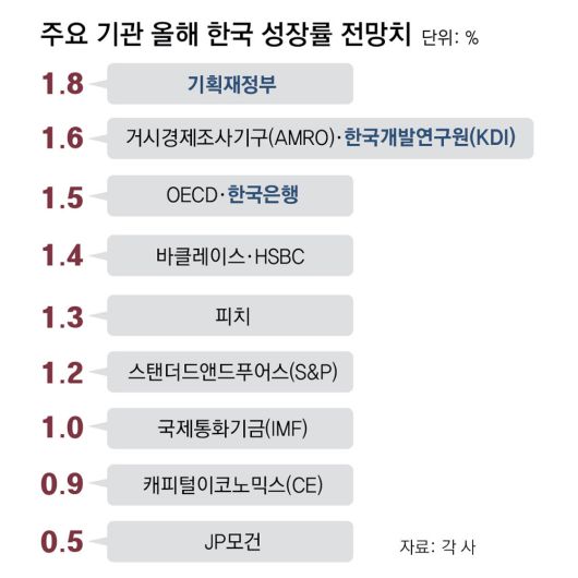 올해 연간 성장률도 한국은행이 당초 전망한 1.5%보다 낮아질 가능성이 높아졌다. 유수의 글로벌 투자은행(IB)과 해외 기관들은 올해 한국의 성장률 전망치를 줄줄이 끌어내리고 있다.