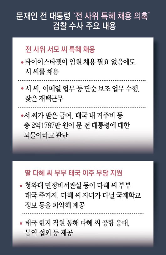검찰은 문 전 대통령이 딸 부부의 생계를 지원하려고 하면서 사건이 시작됐다고 판단했다. 딸 부부가 경제적 어려움으로 갈등을 겪자, 문 전 대통령이 이 전 의원을 통해 무직이던 사위 서 씨를 타이이스타젯 상무로 채용시켜 급여를 가장해 손자의 국제학교 학비와 태국 생활비 등을 지원했다는 것이다. 검찰은 문 전 대통령이 소득이 없는 딸 부부에게 경제적 지원을 해왔던 만큼 이들을 ‘경제공동체’로 판단하고, 제3자 뇌물죄가 아닌 직접 뇌물죄를 적용했다.
