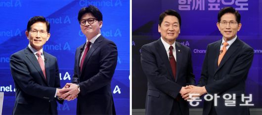 김문수vs한동훈, 안철수vs김문수 ‘맞수토론’ 국민의힘 김문수 전 고용노동부 장관(왼쪽 사진 왼쪽)과 국민의힘 한동훈 전 대표(오른쪽), 김 전 장관과 국민의힘 안철수 의원(오른쪽 사진 왼쪽)이 24일 서울 종로구 동아미디어센터 채널A 오픈스튜디오에서 ‘일대일 맞수토론’을 하기 전에 서로 악수를 하고 있다. ‘일대일 맞수토론’은 2차 경선 진출자 4명이 일대일로 맞붙어 토론하는 형식으로 내일까지 진행된다. 장승윤 기자 tomato99@donga.com |