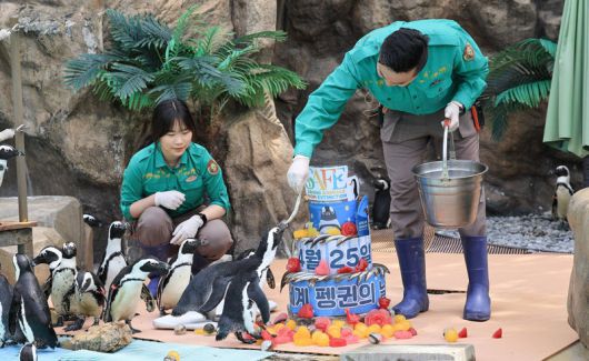 24일 경기 용인시 에버랜드 펭귄아일랜드에서 사육사들이 ‘세계 펭귄의 날’(4월 25일)을 앞두고 펭귄들에게 특식을 제공하고 있다. 이날 펭귄들은 양미리를 얹은 케이크와 비눗방울 놀이 등으로 특별한 시간을 보냈다. 에버랜드 제공 ⓒ 동아일보 & donga.com, 무단 전재 및 재배포 금지