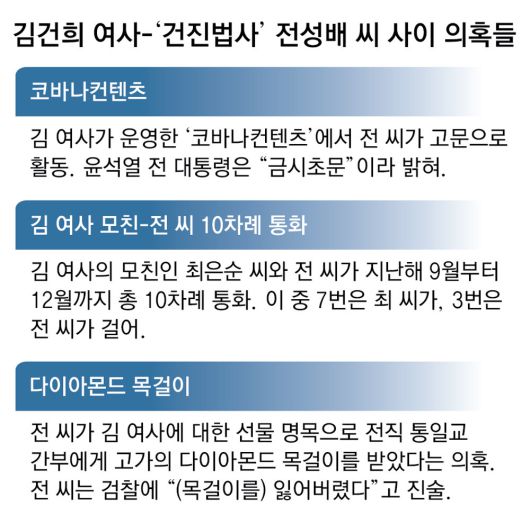 전 씨와 김 여사 및 주변 관계도 추가로 드러나고 있다. 앞서 김 여사가 운영한 코바나컨텐츠의 ‘고문’이라고 적힌 전 씨의 명함이 공개된 바 있다. 또 전 씨가 지난해 김 여사의 어머니 최은순 씨와 10차례 통화한 사실도 드러났다. 이들의 통화는 짧게는 1분여에서 길게는 1시간 48분까지 이어졌다. 윤 전 대통령의 첫 번째 국회 탄핵소추안 표결을 하루 앞둔 지난해 12월 6일에도 두 사람이 통화한 것으로 나타났다. 김 여사 측은 본보의 수차례에 걸친 입장 요청에 답을 하지 않았다.