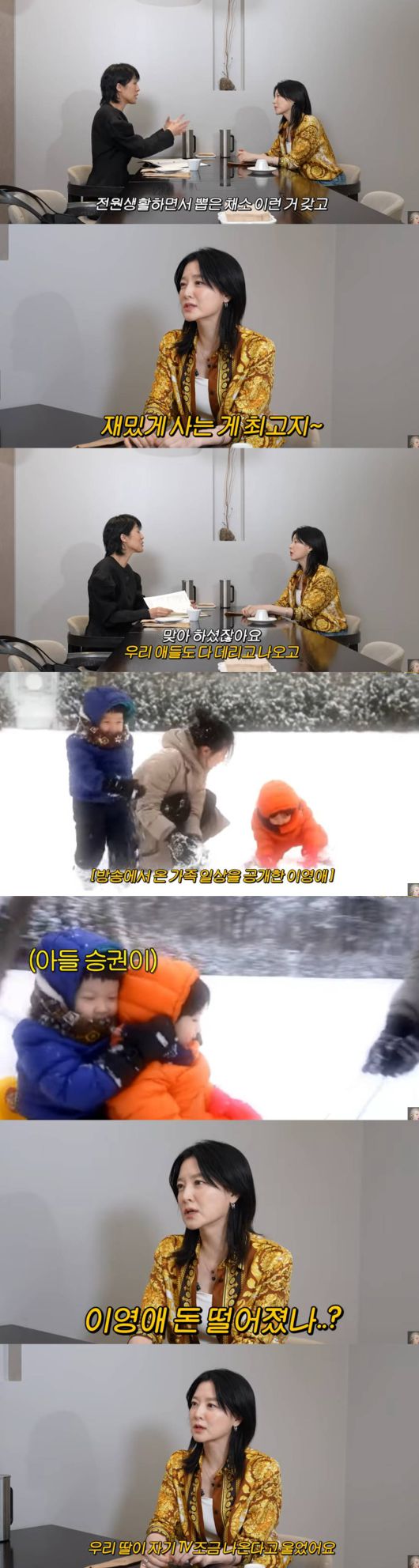 신비주의를 깨고 연극, 드라마, 유튜브 출연 등 활발한 활동을 이어가고 있는 이영애는 이날 "애 낳고 이러니까 '인생 뭐 있어 재밌게 사는 게 최고지' 싶더라. 그래서 SBS '이영애의 만찬'에도 애들 다 데리고 나오고 했었다"고 말했다.