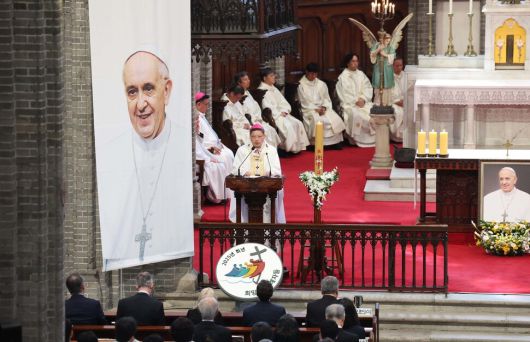 천주교 서울대교구장 정순택 대주교가 24일 오전 서울 중구 명동대성당에서 프란치스코 교황 추모 미사를 집전하고 있다. 사진공동취재단 |