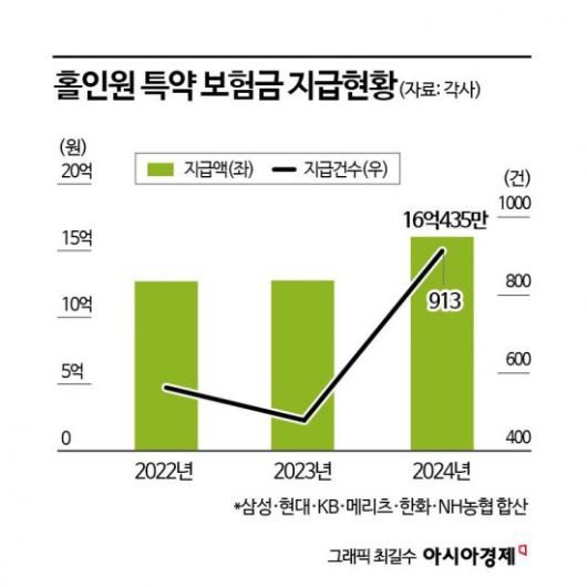 홀인원 특약의 보험금 지급도 최근 두드러지게 증가하는 추세다. 아시아경제가 손해보험사 6곳(삼성·현대·KB·메리츠·한화·NH농협)으로부터 확보한 홀인원 보험금 지급현황을 보면 2022년 12억7077만원이었던 홀인원 보험금은 2024년 16억435만원으로 26.2% 증가했다. 이 기간 지급건수는 563건에서 913건으로 62.1% 급증했다.