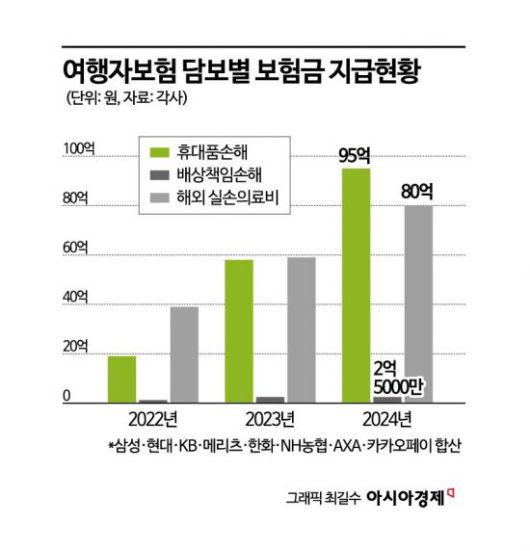 아시아경제가 여행자보험을 판매하는 보험사 8곳(삼성·현대·KB·메리츠·한화·NH농협·AXA·카카오페이)으로부터 입수한 여행자보험 담보별 보험금 지급현황을 보면 휴대품손해 지급액은 2022년 19억원, 2023년 58억원, 2024년 95억원으로 매년 급증하는 추세다. 같은 기간 건수도 8937건, 3만1696건, 5만9370건으로 대폭 늘었다. 물론 이 수치가 보험사기와 직접적으로 연관된 건 아니지만 깊은 상관성을 보인다는 게 보험업계 의견이다.