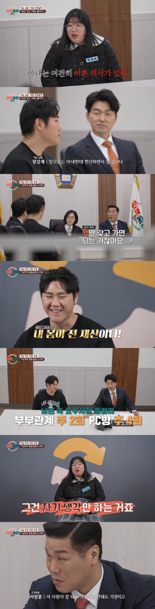 이에 아내 측은 "일주일에 부부관계 2회, PC방 2회로 하겠다"고 말했다. 이때 박민철 변호사가 "PC방이 그렇게 염려되시면 부부관계 6회로 하자"고 제안했고, 남편도 "저는 그럼 PC방 포기하겠다"고 말했다.