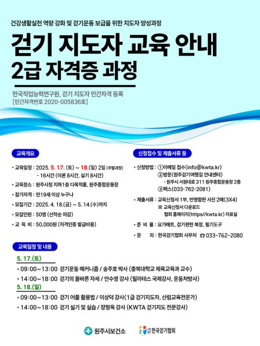[스포츠서울ㅣ원주=김기원기자]원주시보건소는 시민들의 올바른 걷기 문화 촉진을 위해 5월 14일까지 상반기 걷기지도자 2급 과정 수강생 50명을 선착순 모집한다.
