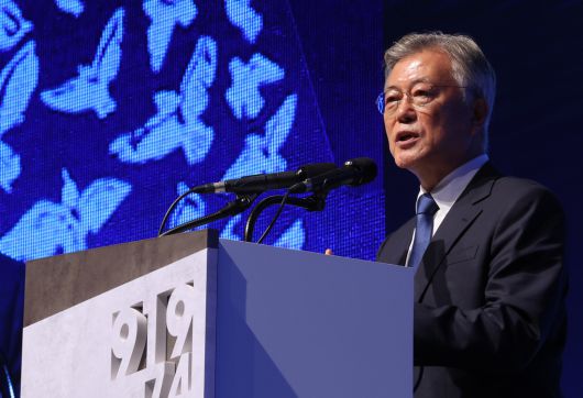 문재인 전 대통령이 2023년 9·19 평양공동선언 5주년 기념식에서 인사말을 하고 있다. 연합뉴스 |