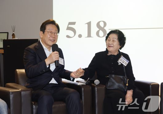 이재명 더불어민주당 대선 경선 후보가 24일 광주 전일빌딩245에서 열린 민주주의 간담회에서 김길자 문재학열사 모친과 인사를 나누고 있다. 2025.4.24/뉴스1 ⓒ News1 김태성 기자 |