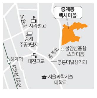 중계본동 주택재개발 정비사업은 일명 백사마을로 알려진 노원구 중계본동 30-3번지 일대를 26개 동, 지하 4층∼지상 35층, 3178가구 규모의 아파트 단지로 개발하는 것이다.백사마을 위치도. 매경DB |