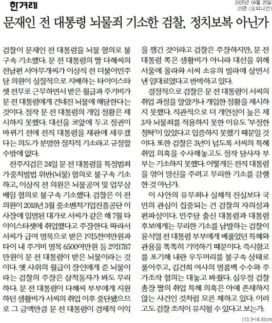 한겨레 = 문재인 전 대통령 뇌물죄 기소한 검찰, 정치보복 아닌가