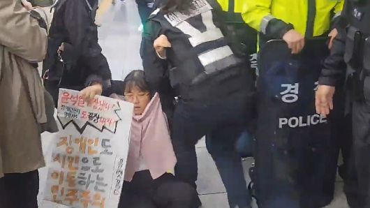 오늘(25일) 오전 서울 지하철 4호선 혜화역에서 출근길 선전전을 벌이던 전국장애인차별철폐연대가 다시 강제 퇴거당했습니다.