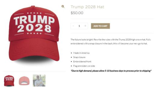 트럼프 대통령이 3선 출마를 원한다고 밝힌 지 몇 주 후, 그의 이름을 딴 공식 스토어에서 ‘TRUMP 2028’ 문구가 적힌 빨간색 모자를 판매하기 시작했다.