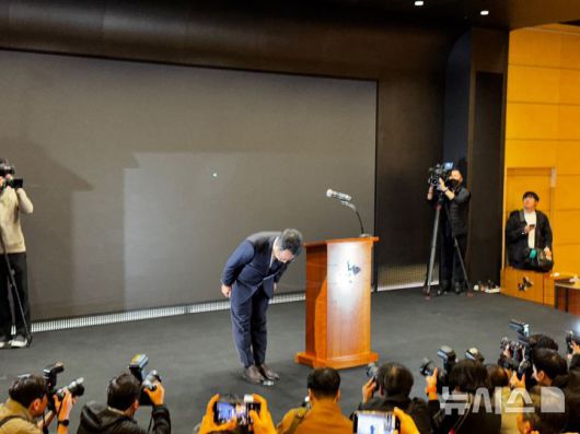 [서울=뉴시스]유영상 SK텔레콤 대표이사가 25일 SK텔레콤 T타워 4층 SUPEX홀에서 열린 고객 정보 보호조치 강화 관련 언론설명회에서 고개 숙여 사과하고 있다. (사진=심지혜 기자) 2025.04.25.