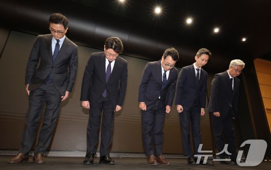 (서울=뉴스1) 이동해 기자 = 유영상 SK텔레콤 대표이사를 비롯한 임원들이 25일 서울 중구 SKT타워에서 고객 정보 보호조치 강화 설명회를 열고 SK텔레콤 이용자 유심(USIM) 정보 해킹에 대해 고개 숙여 사과하고 있다. 왼쪽부터 이종훈 Infra 전략본부장, 홍승태 고객가치혁신실장, 유 대표이사, 배병찬 MNO AT본부장, 윤재웅 마케팅전략본부장. 2025.4.25/뉴스1