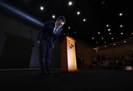 유영상 SK텔레콤 대표이사가 25일 서울 중구 SKT타워에서 고객 정보 보호조치 강화 설명회를 갖고 SKT 이용자 유심(USIM) 정보 해킹에 대해 고개 숙여 사과하고 있다. 신태현 기자 holjjak@ |