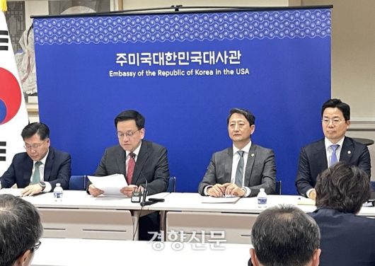 미국과의 2+2 통상 협의를 위해 방미한 최상목 경제부총리 겸 기획재정부 장관과 안덕근 산업통상자원부 장관이 24일(현지시간) 주미대사관에서 브리핑을 열고 있다. 워싱턴 | 김유진 특파원 |