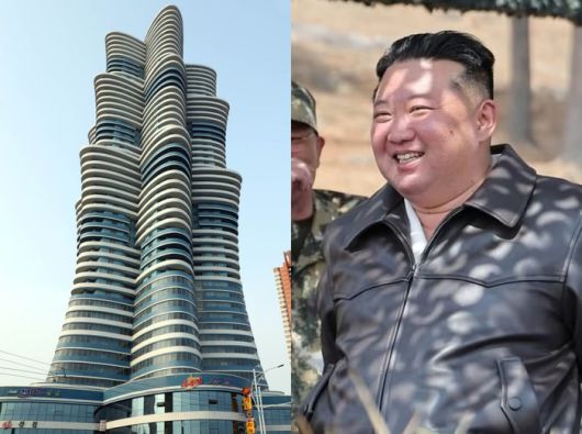 평양의 53층 아파트와 김정은 노동당 위원장. [사진 = 뉴스1] |