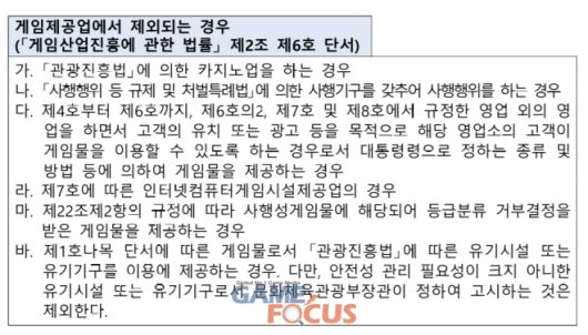 단, 구글과 애플 등과 같이 같이 게임물 관련 사업자와 중개계약을 맺고 정보통신망을 이용해 게임물을 유통하거나 게임물 서비스를 제공하는 플랫폼 사업자의 경우 국내대리인 지정제도 대상에서 제외되며 기준에 충족하지 않더라도 게임이용자에게 현저한 피해를 입히는 사고가 발생했거나 발생할 가능성이 있어 국내대리인을 지정할 필요가 있다고 문화체육부장관이 인정한 자의 경우 마찬가지로 국내대리인을 지정해야 된다. 여기서 사고와 사고 발생 가능성이 있는지의 판단 여부는 언론 보도, 국회 지적, 민원 등을 종합적으로 고려해 판단하게 된다.