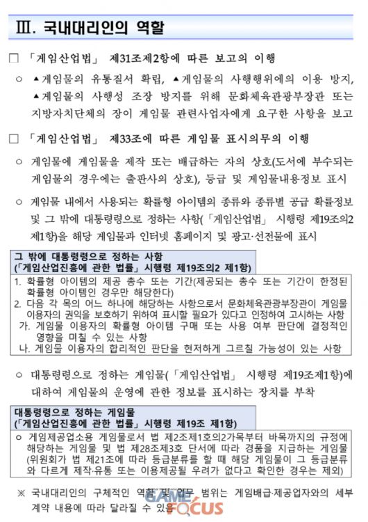 국내대리인은 게임산업법 제31조 제2항에 따라 문체부 장관 또는 지방자치단체의 장이 게임물 관련사업자에게 요구한 사항을 보고해야 되며 제33조에 따른 게임물 표시의무(상호, 등급, 게임물 내용 정보) 및 확률형 아이템의 종류와 종류별 공급 확률정보, 그밖에 대통령령으로 정하는 사항(시행령 19조의2제1항)을 해당 게임물과 인터넷 홈페이지, 광고 선전물에 표시되어야 된다.