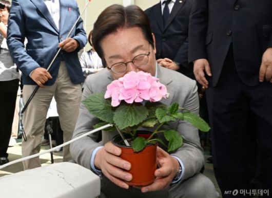 25일 오전 전남 나주시 전남농업기술원 에너지 자립형 스마트팜 연구동. 수국으로 가득 찬 대형 온실에 이재명 더불어민주당 대선 예비후보가 들어섰다. 이 예비후보는 쭈그리고 앉아 화분을 들고 이리저리 꽃을 살펴보며 스마트팜 관계자에게 질문을 쏟아냈다.