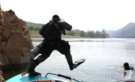 박재석 수중지질 조사팀 잠수사가 단양 도담삼봉을 조사하기 위해 물속으로 뛰어들고 있다.2025.4.25./뉴스1 ⓒ News1 손도언 기자 |