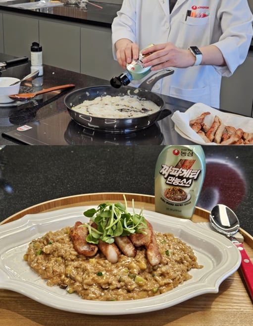 지난 24일 오후 서울 동작구에 있는 농심 도연관 조리과학실. 깔끔한 요리복을 입은 연구원이 각종 식재료와 농심의 ‘짜파게티 만능소스’ 제품을 준비해 놓고 인덕션을 가열했다. 뜨겁게 달궈진 팬 위에서 쌀밥은 잘게 썬 양파와 마늘, 호박, 표고버섯과 어우러지며 버터와 함께 볶아졌다. 이후 팬에 생크림을 부은 뒤 ‘짜파게티 만능소스’를 두 큰술 넣고 여러 차례 휘젓자 은은한 갈색을 띤 리소토(리조또)가 완성됐다. 맛을 보니 짜장 소스의 느낌은 살아있으면서도 단맛과 짠맛, 감칠맛이 적절하게 느껴졌다.