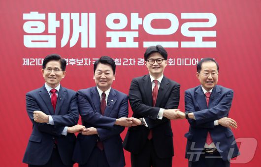 국민의힘 김문수·안철수·한동훈·홍준표 경선 후보가 23일 서울 영등포구 중앙당사에서 열린 제21대 대통령후보자 선출을 위한 2차 경선 토론회 미디어 데이에서 기념촬영을 하고 있다. 2025.4.23/뉴스1 ⓒ News1 국회사진취재단 |