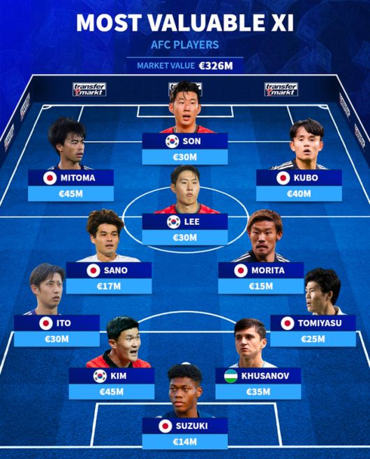 [인터풋볼] 주대은 기자 = 아시아에서 가치가 가장 높은 선수들이 공개됐다.