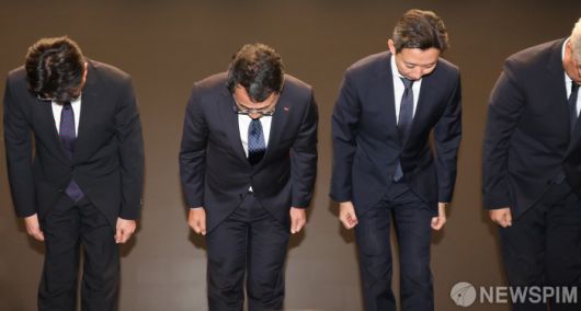 [서울=뉴스핌] 양윤모 기자 = 최근 SK텔레콤이 해킹 공격으로 고객의 유심(USIM) 정보 일부가 외부로 유출된 정황이 포착된 가운데, 유영상 SKT 대표이사와 임원들이 25일 오전 SK텔레콤 T타워 4층 SUPEX홀에서 열린 SK텔레콤 고객 정보 보호조치 강화 관련 언론설명회에 참석 유심 무상 교체를 발표후 머리숙여 사과하고 있다. 2025.04.25 yym58@newspim.com |