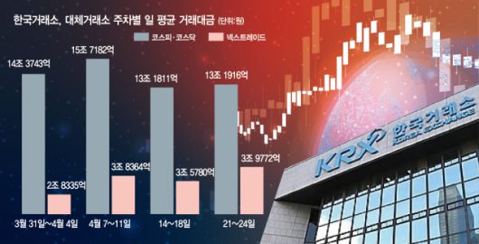 주차별 거래 대금도 증가 추세다. 800종목 거래가 시작된 지난달 31일부터 이달 4일까지 거래 대금은 2조 8335억 원에 그쳤지만 4월 첫째 주(7~11일)에 3조 8364억 원, 둘째 주(14~18일) 3조 5780억 원, 셋째 주(21~24일)에 3조 9772억 원으로 늘어났다. 특히 매매 체결 속도와 수수료가 저렴한 만큼 외국인투자가들이 ATS 거래를 문의하고 있는 것으로 전해졌다.