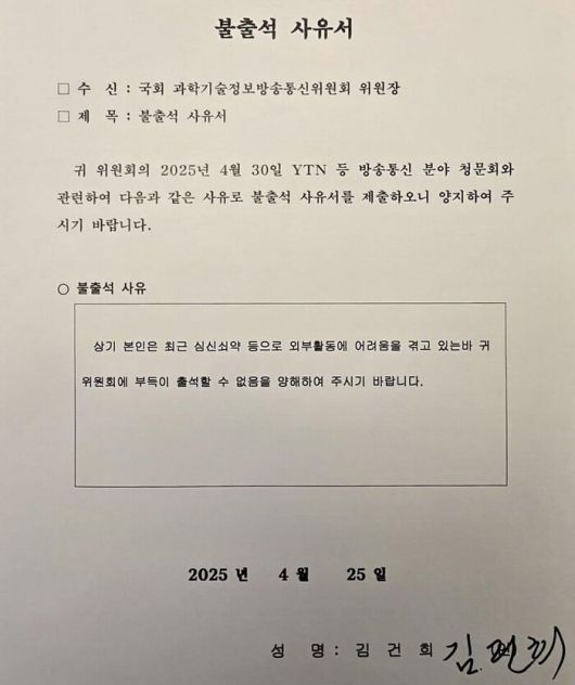 최민희 국회 과방위원장이 공개한 불출석 사유서에는 "심신쇠약 등으로 외부활동에 어려움을 겪고 있는 바 부득이 출석할 수 없음을 양해해 주시기 바랍니다"고 적혀 있습니다.