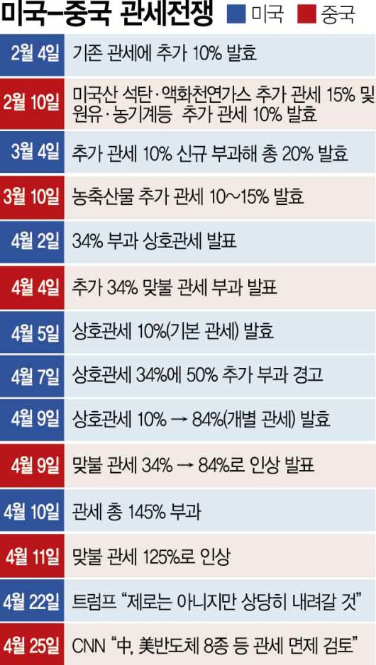 미국과 강 대 강 대치를 이어가던 중국이 메모리 칩을 제외한 미국산 반도체 8종에 부과하던 125%의 초고율 관세를 최근 철회한 것으로 알려졌다. 또 미국산 에탄과 의료장비 등을 관세 면제 대상에 올리는 방안을 놓고 검토에 착수한 것으로 전해졌다. 도널드 트럼프 미국 대통령이 대(對)중국 관세를 “상당히 낮출 수 있다”고 언급하는 등 연일 유화 제스처를 보이는 가운데 중국 당국도 ‘치킨게임’에서 한발 물러나 출구전략에 나섰다는 분석이 나온다.