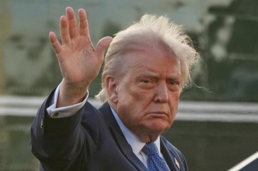 도널드 트럼프 미국 대통령이 24일 버지니아주 리즈버그에 있는 공항에서 취재진에 인사하고 있다. 리즈버그=AP 연합뉴스 |