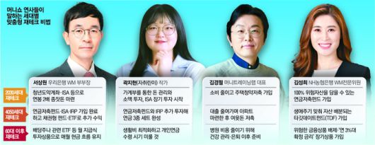 이 시기에 청년도약계좌와 주택청약저축엔 무조건 가입하라고 전한다. 이 같은 필수 금융상품을 만기까지 유지하는 것이야말로 재테크의 시작이라는 것. 4050세대의 경우 ‘시장금리+α’에 맞는 금융상품 활용이 필요하다는 입장이다. 연금 삼총사는 기본이고, 채권형(혼합형) 펀드나 상장지수펀드(ETF)를 통해 안정성을 높일 시기라는 것이다.