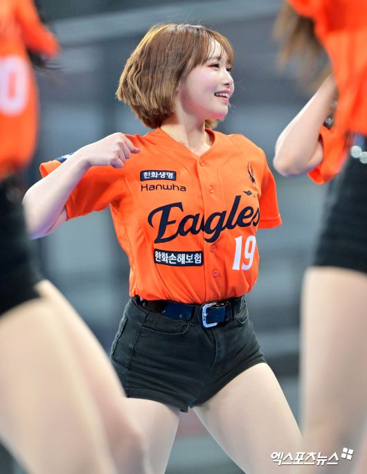 (엑스포츠뉴스 대전, 김한준 기자) 25일 오후 대전 한화생명 볼파크에서 열린 '2025 신한 SOL Bank KBO리그' KT 위즈와 한화 이글스의 경기, 한화 치어리더 아야카가 멋진 공연을 선보이고 있다.김한준 기자 kowel@xportsnews.com
