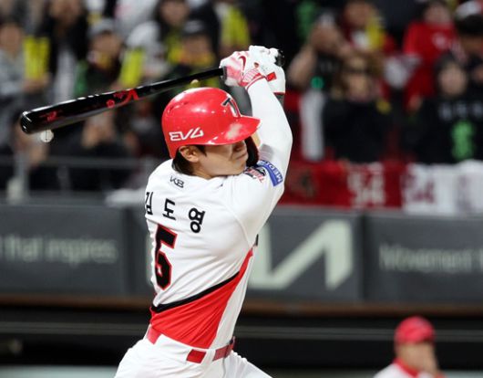 광주-기아 챔피언스필드를 가득 메운 홈 팬들의 응원 속에 등장한 김도영은 곧바로 손주영의 초구 123km/h 커브를 공략해 2타점 동점 중전 적시타를 때렸다. 1루를 향해 달려가면서 환호한 김도영은 곧바로 대주자 박재현으로 교체돼 더그아웃으로 물러났다.