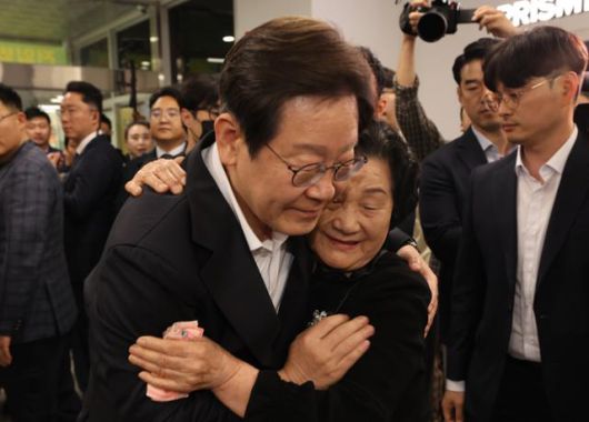 이재명 더불어민주당 대선 후보가 24일 광주 동구 전일빌딩 245 1층에서 고 문재학 어머니 김길자씨와 포옹하고 있다. 광주=뉴스1 |