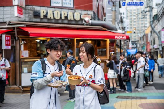 한국 야구장의 대표 상품은 스포츠 경기도, 좋은 시설도 아닌 ‘먹을거리’다. 한국 야구장 관광을 위해 한국에 온 대만 고등학생들도 닭꼬치와 소떡소떡, 핫도그, 닭강정, 오뎅, 크림새우와 망고를 올린 요거트 아이스크림까지 야무지게 시켜 놓고 먹방을 펼쳤다. 소셜미디어(SNS)에 ‘한국에서만 먹을 수 있는 음료수’로 소개된 밀키스를 사 마시는 것도 잊지 않았다.