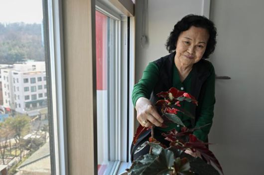 2월 27일 서울 강북구 번동의 고령자 복지주택에 사는 김준임씨가 자택에서 키우는 꽃을 매만지고 있다. 정다빈 기자 |